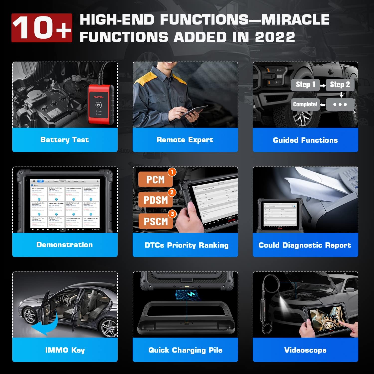 FCA Auto Auth for Chrysler, Dodge, Jeep, Fiat in/after 2017; AUTO SCAN 2.0; Battery Test (Need BT506); Endoscope Function (MV108S); WIFI Print; Pre&Post-Scan; Autel Cloud Diagnosis Report; Remote Expert.