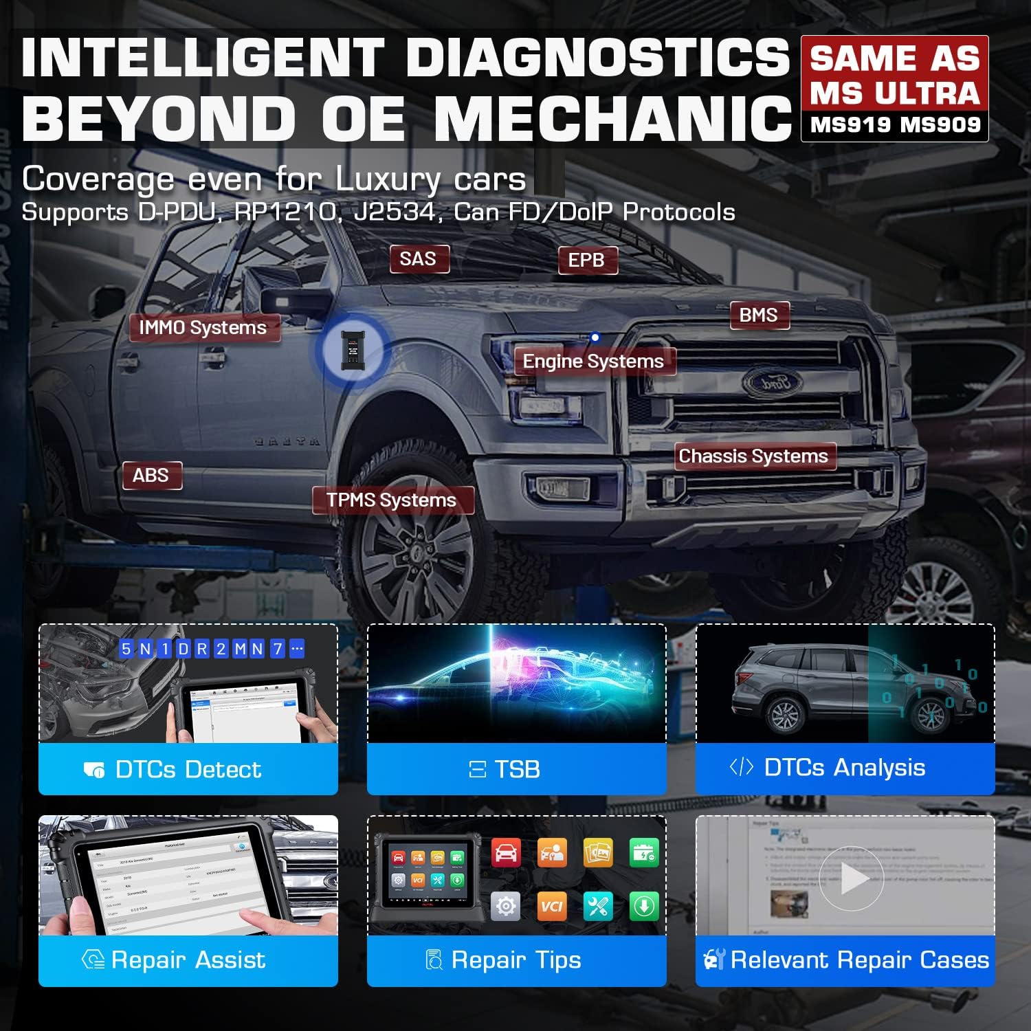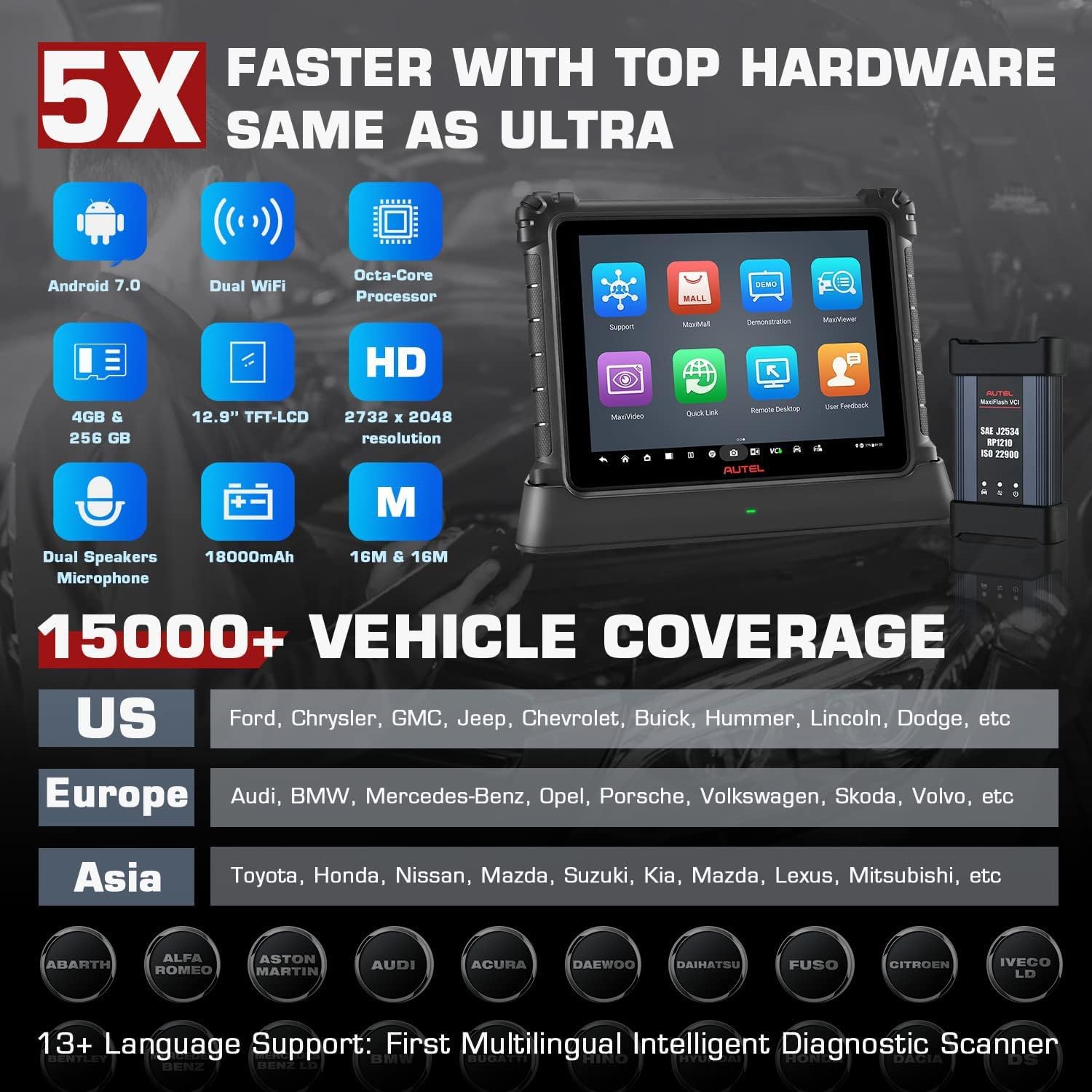 Same Hardware as Autel Ultra, Upgrade of MS919/ MS909: Android 7.0, Samsung Exynos8895 Octa-core Processor, 4GRAM & 256G ROM, 18000mah battery, 12.9’’ TFT-LCD, 2732 x 2048 resolution, Dual WIFI, 16MP&5MP Rear&Front Camera, Dual Speakers, etc.