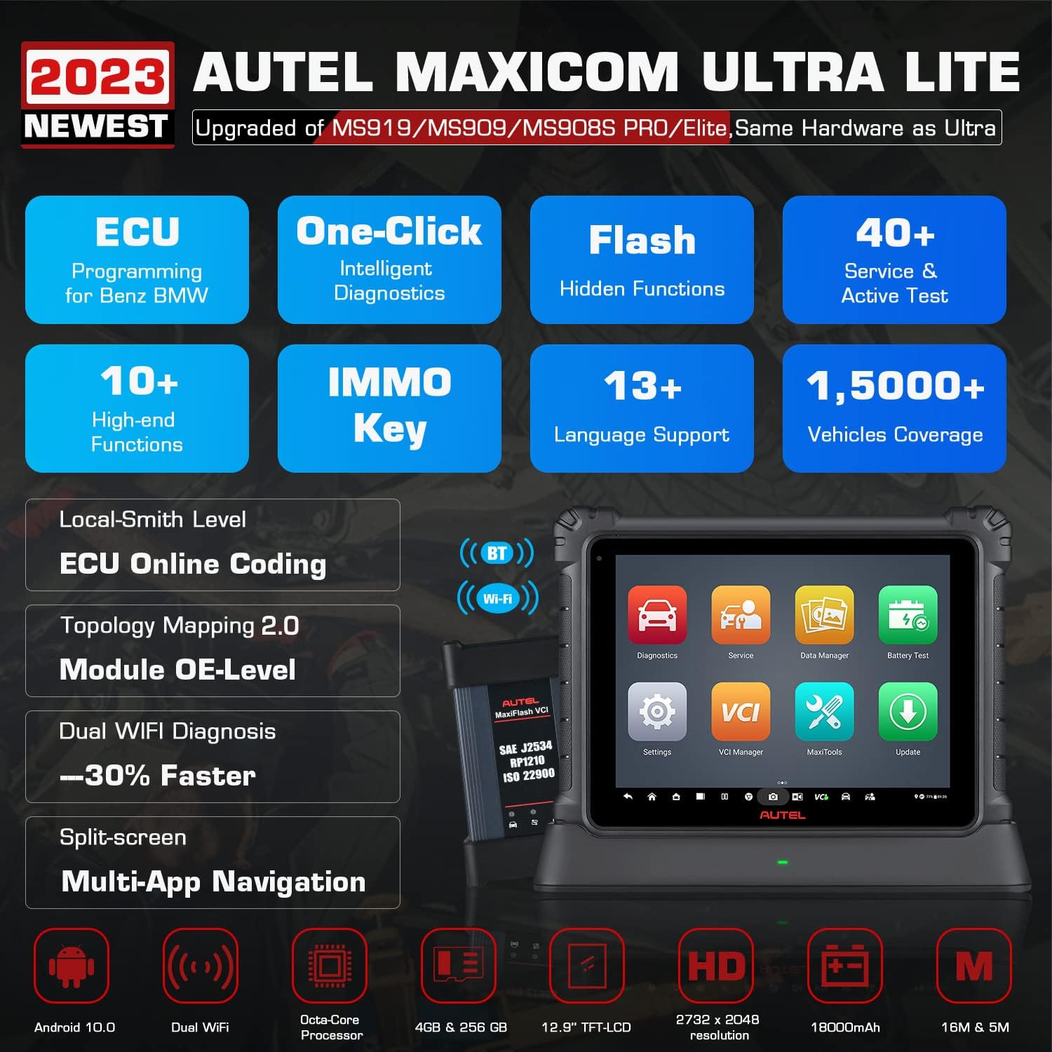 Autel MaxiCOM Ultra Lite has same hardware as MS Ultra: 12.9inch Split-screen experience, Android 7.0, Exynos8895 Oct-core processor, 4G & 256GB capacity, 18000mah double battery, 5 times faster than traditional diagnostic scanner and bring you fast multi-app diagnostic experience.