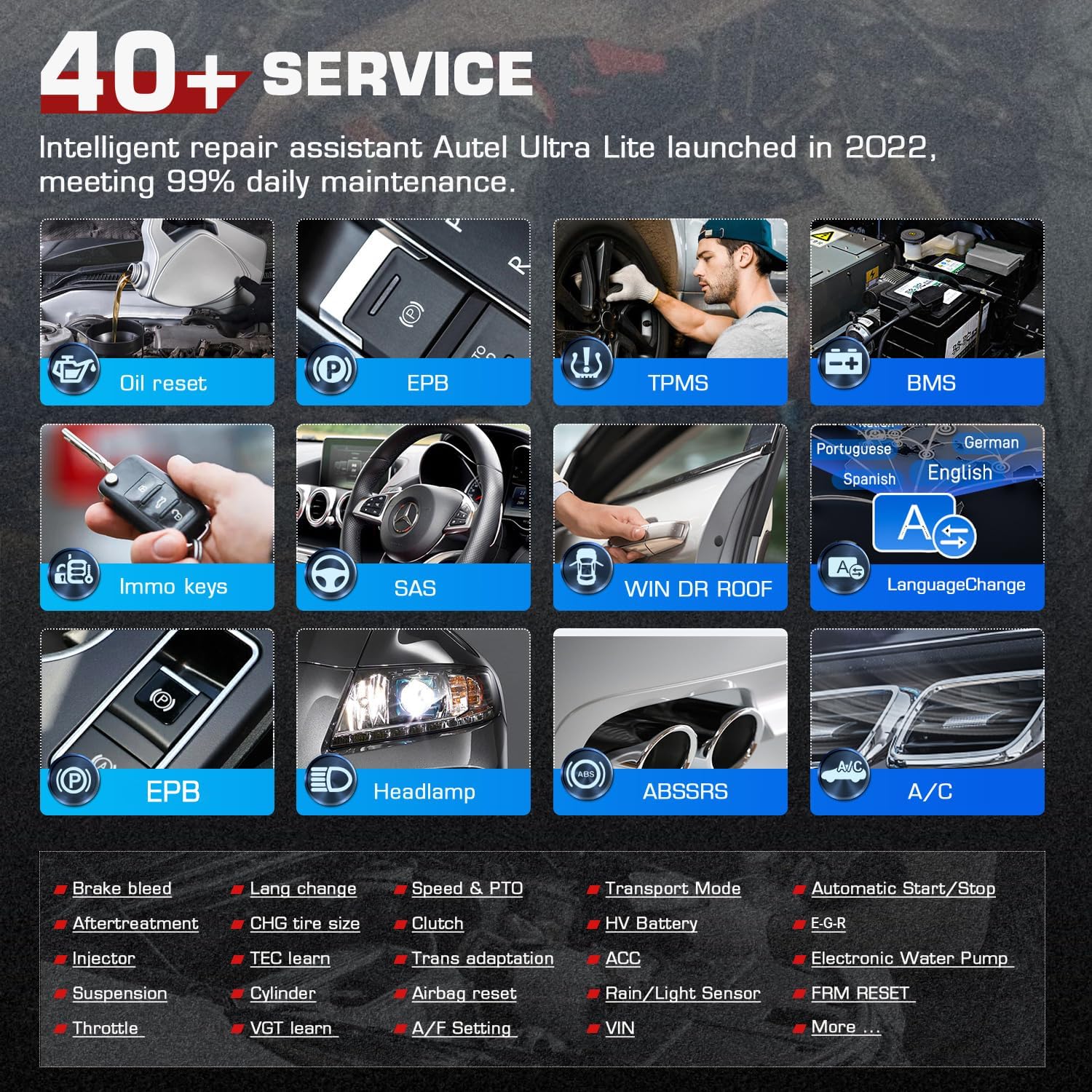 Autel MaxiCOM Ultra Lite multilingual scan tool is designed with 40+ service functions to meet daily vehicle maintenance needs, such as Oil Reset, SAS Calibration, EPB, Suspension Calibration, Thr-ottle Matching, Trans Adaptation, ABS Bleeding, BMS Reset, Headlamp, IMMO Keys, TPMS Reset, Lang Change, TEC Learn, A/F Setting, Airbag, Win DR Roof, Battery Replacement, Zer-o Point Calibration, Weight Sensors Calibration, VG-T T-urbo Calibration, Injector Coding, etc. More functions and models are being researching. Autel will update software at first once work out.