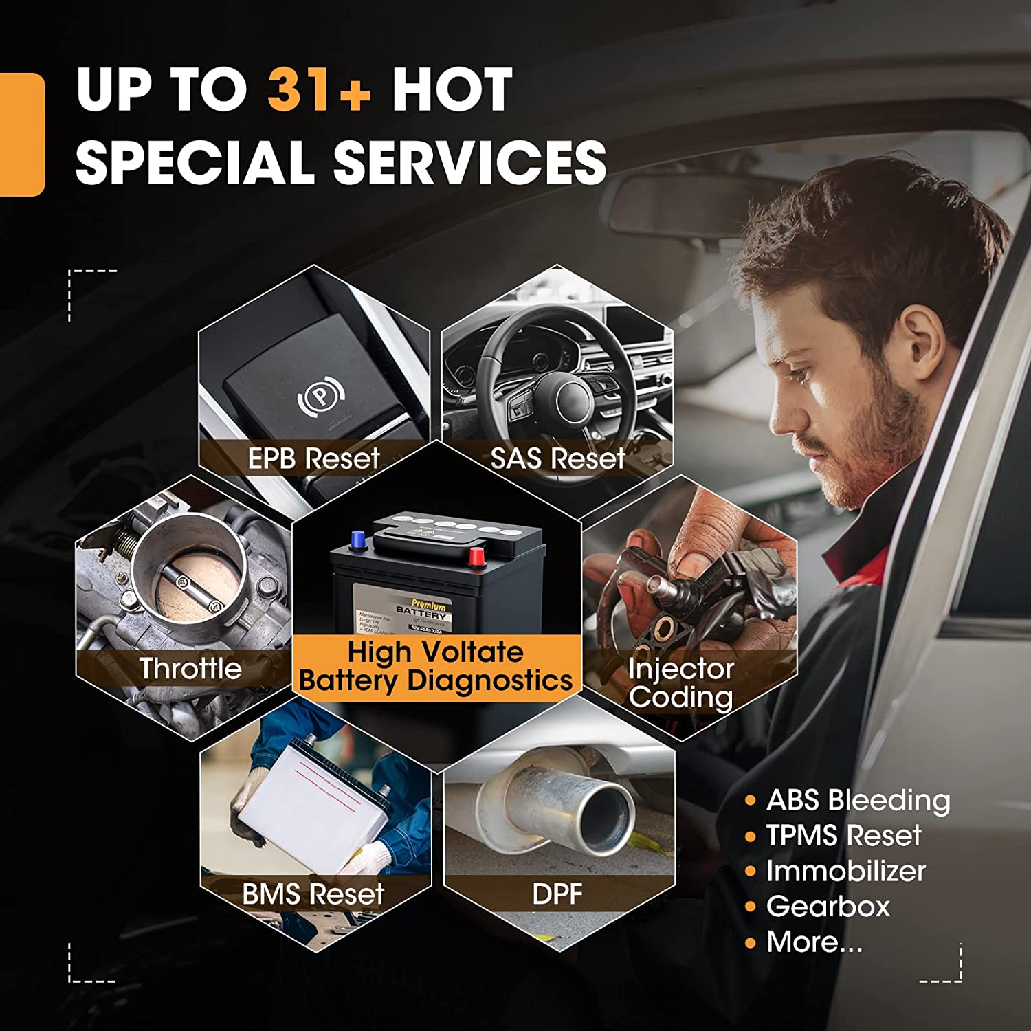 And add more reset functions: A/F Reset, ADBLUE, Coolant Bleed, EGR Reset, Language Set, NOX Reset, Seat Calibration, Transport Mode, Tire Setting, Stop/Start, Power Balance, AC System Relearn/Initialization, Windows Calibration, High Voltage Battery Diagnostics, still growing with regular online updates.